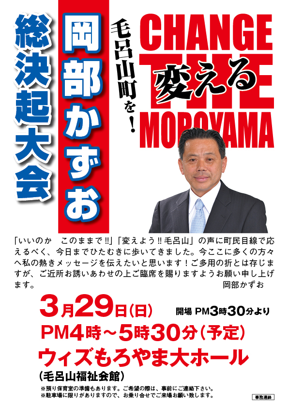 ←「岡部 かずお 「総決起大会」!!」前の記事へ 次の記事へ「2015.3.24 町長選の争点」→